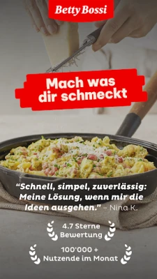 Slut med at stirre tomt ind i køleskabet eller mangle ideer til aftensmaden. Betty Bossi præsenterer dagligt nye, sæsonbetonede opskrifter, der garanterer frisk inspiration lige ved hånden. Har du specifikke ingredienser, du ønsker at bruge? Indtast blot dine råvarer i søgefeltet, og lad Betty Bossi trylle en perfekt opskrift frem på ingen tid. Uanset om du længes efter pasta, en sund salat, lækre apéro-snacks eller en overdådig fødselsdagskage, giver de intuitive filtre dig mulighed for at tilpasse din søgning – også efter specifikke diætbehov som glutenfri, vegansk eller laktosefri. Når madlavningen går i gang, guider den smarte madlavningstilstand dig trin for trin, så intet går galt.