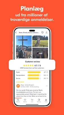 Din oplevelse med GetYourGuide rækker langt ud over bookingfasen. Når du er fremme ved din destination, opdager du nemt spændende aktiviteter i nærheden og modtager personlige anbefalinger, der forvandler ethvert øjeblik til en mulighed for opdagelse. Og for at sikre en problemfri rejse, er vigtige detaljer altid tilgængelige – selv uden internetforbindelse. Få adgang til dine mobilbilletter, arrangørens kontaktoplysninger og rutevejledninger til dine bookede oplevelser offline. GetYourGuide er designet til den moderne globetrotter, der søger frihed, ubesværet navigation og uforglemmelige minder. Vi værdsætter din feedback højt, så del gerne dine oplevelser med GetYourGuide for at hjælpe os med at skabe endnu bedre rejser.