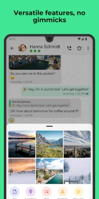 Med Threema er dine samtaler mere end blot sikre – de er også utroligt alsidige. Send tekst- og talebeskeder, krydr dem med emoji-reaktioner, eller foretag krystalklare ende-til-ende krypterede tale- og videoopkald, både individuelt og i grupper. Del vigtige lokationer med lethed, eller send filer i alle tænkelige formater, fra PDF'er til GIF'er og MP3-filer, uden bekymring. Du har desuden fuld kontrol over dine sendte beskeder, med mulighed for at redigere dem eller slette dem helt for alle i chatten. For ubesværet adgang findes Threema også som en dedikeret desktop-app og webklient, så du kan chatte komfortabelt fra din computer.